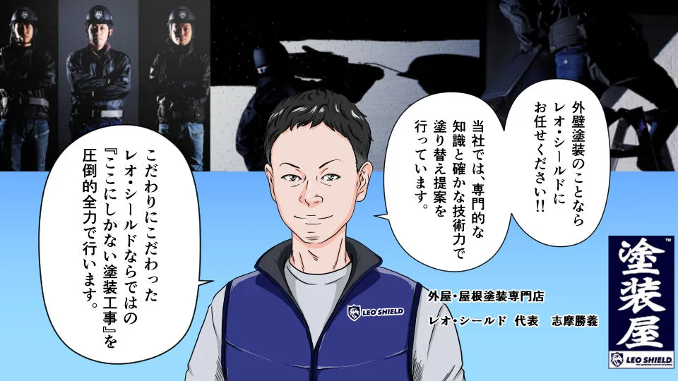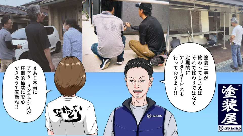 築15年以上となり外壁、屋根塗装をしなければいけないと思っていたところで近所で工事をしていたレオ・シールドさんんからお声がけしてもらい外壁塗装の種類やその必要性をわかりやすく説明してもらいました。社長さんの熱い塗装魂に心打たれ工事をお願いする事にしまいた。