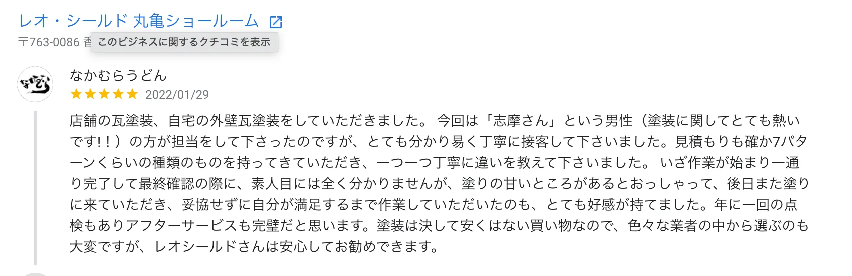 複数社に見積もりをお話をしましたが、他社では安いけど何か腑に落ちないことがありましたが、見積もりの細かさや沢山の提案を頂き、塗装について丁寧に詳しく説明いただき信頼が一番できると感じました。